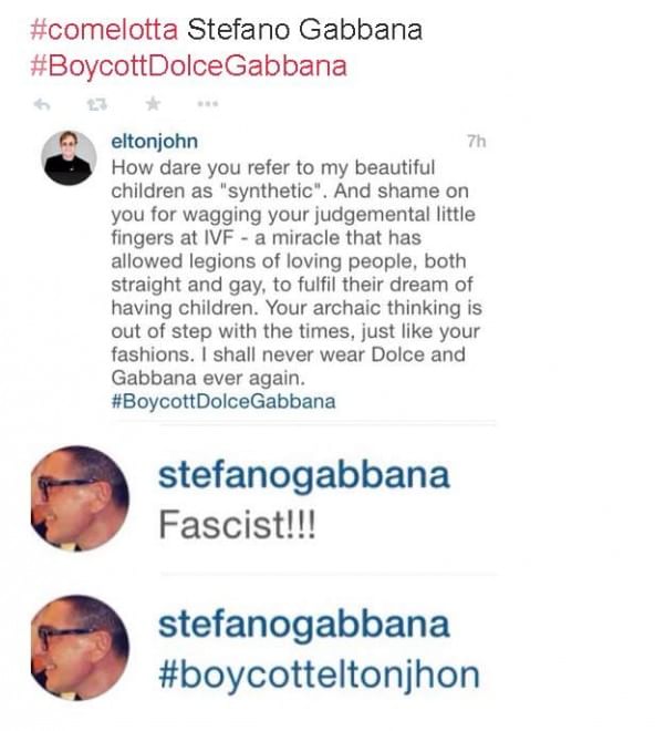 Elton John (Il Re Leone, Aida, Billy Elliot) dichiara guerra a Dolce e Gabbana, dopo che i due stilisti italiani avevano detto in un’intervista no alle adozioni gay e ai "figli della chimica che non hanno mamma e papà". Il cantautore inglese, che ha due figli ottenuti con la fecondazione in vitro con il marito David Furnish, ha duramente attaccato Domenico Dolce e Stefano Gabbana, anche loro omosessuali e per lungo tempo legati da una relazione sentimentale, che si erano detti su ‘Panorama’ contrari alle famiglie gay, e ancor di più se con figli frutto della fecondazione artificiale. (Fonte: repubblica.it)