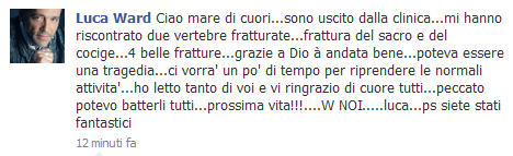 Due vertebre fratturate, frattura del sacro e del coccige nell’incidente all’Isola dei Famosi per Luca Ward (Tutti Insieme Appassionatamente). Lo ha scritto lui stesso sulla sua pagina Facebook appena uscito dalla clinica dove era stato ricoverato dopo l’abbandono del reality show di Raidue. Sempre su facebook ha aggiunto: aggiunto: "Grazie a Dio è andata bene…poteva essere una tragedia… Ci vorrà un po’ di tempo per riprendere le normali attività… peccato potevo batterli tutti".