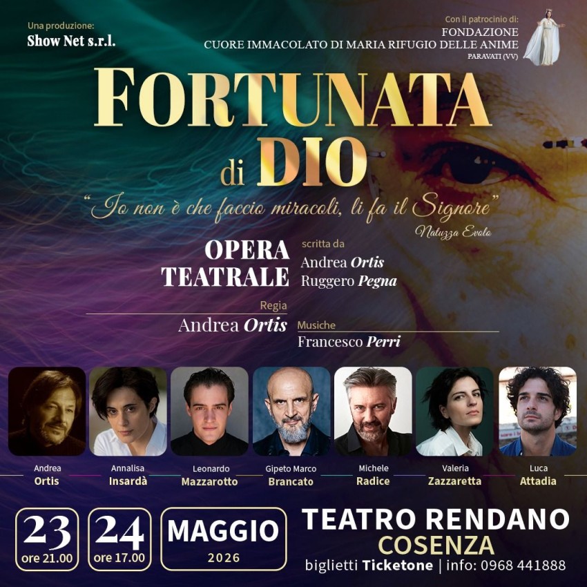 È affidata ad Andrea Ortis (La Divina Commedia Musical, Van Gogh Cafè, Frida) la regia di Fortunata di Dio, l’opera teatrale dedicata alla vita di Natuzza Evolo, prodotta dalla Show Net di Ruggero Pegna. Il testo è scritto dallo stesso Pegna insieme a Ortis, che guida un team artistico e tecnico articolato.