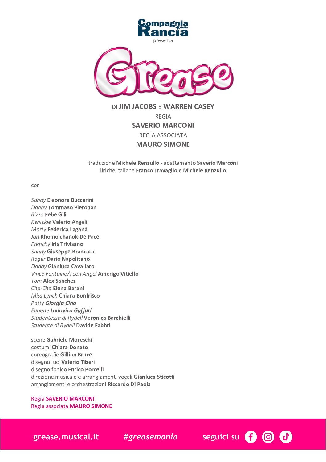 Un gruppo di giovanissimi performer, guidati dalla voce travolgente e dall’incontenibile energia di Eleonora Buccarini nel ruolo di Sandy, e dal talento e carisma di Tommaso Pieropan nel ruolo di Danny, darà nuova luce a icone generazionali, trasformando la Rydell High School in un luogo dove la pluralità dei talenti – tra danza, canto e recitazione – esplode in un’armonia perfetta e in un’energia travolgente.