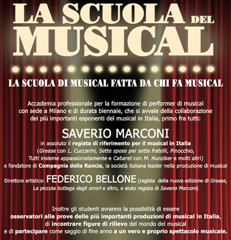 Avranno luogo il prossimo 20 maggio i nuovi esami d’ammissione per l’anno accademico 2007/2008 de “La Scuola del Musical” di Milano, il corso professionale per performers, con l’obiettivo di offrire una seria opportunità di formazione multi-disciplinare per l’inserimento nel mondo dello spettacolo. La Direzione Artistica della scuola è di Federico Bellone.