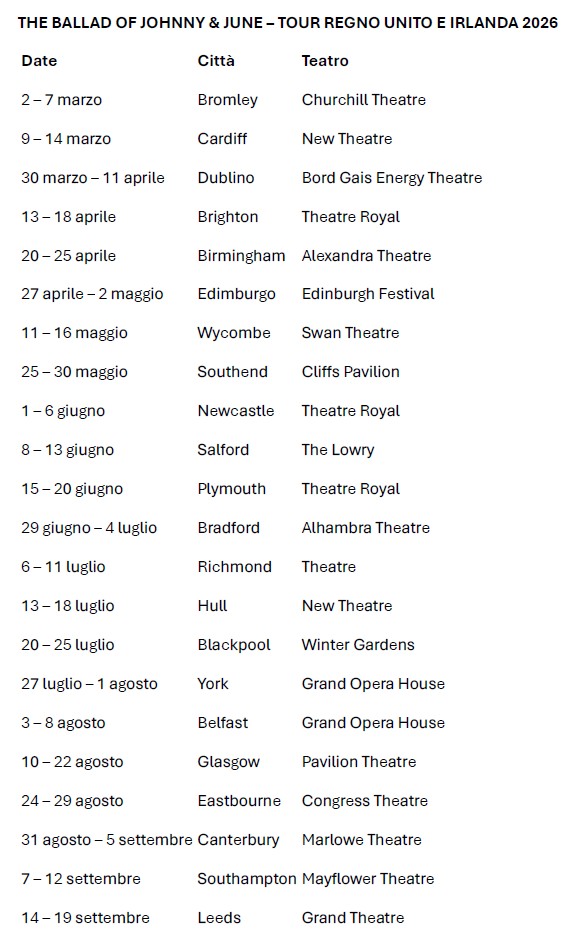 “Siamo entusiasti di portare questa acclamata produzione di The Ballad of Johnny and June nei teatri del Regno Unito e dell’Irlanda per un grande tour nel 2026. È un viaggio attraverso l’amore, la lotta e la redenzione, raccontato attraverso alcune delle più grandi canzoni mai scritte e realizzato da un team creativo eccezionale. Non vediamo l’ora che il pubblico viva questa straordinaria storia, che cattura la passione e la forza di due vere icone della musica”.
