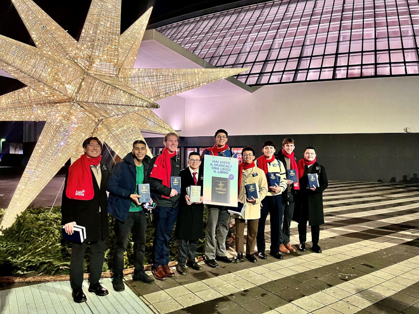 Davanti al TAM Teatro Arcimboldi Milano, dove va in scena il musical di Trey Parker, Matt Stone e Robert Lopez, un gruppo di mormoni sta distribuendo copie del Libro di Mormon al pubblico in ingresso.