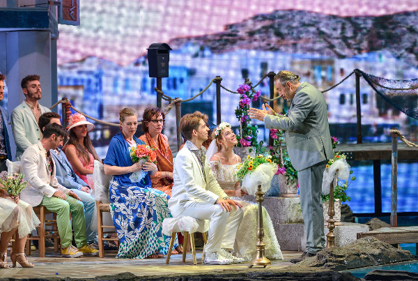 Una messa in scena spettacolare e tecnologica: grazie a un pontile sospeso su oltre 9mila litri di acqua, barche ormeggiate e un vero bagnasciuga, le pedane girevoli, una locanda dai caratteristici colori nelle sfumature del bianco e del blu e cascate di bouganvillea, si ha davvero l’impressione di godere della bellezza di una incantevole isoletta greca.