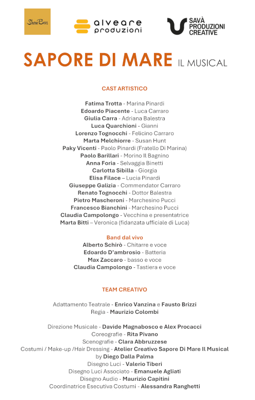 Dopo il successo del tour di debutto della scorsa stagione, torna in scena “Sapore di Mare – Il Musical”: un viaggio evocativo nel cuore degli Anni ’60, fra amori estivi, spensieratezza e melodie senza tempo. Lo spettacolo che ha conquistato il pubblico italiano torna a emozionare, riportando in vita le atmosfere indimenticabili delle estati versiliesi, ispirato all’iconico film cult che ha segnato un’intera generazione.