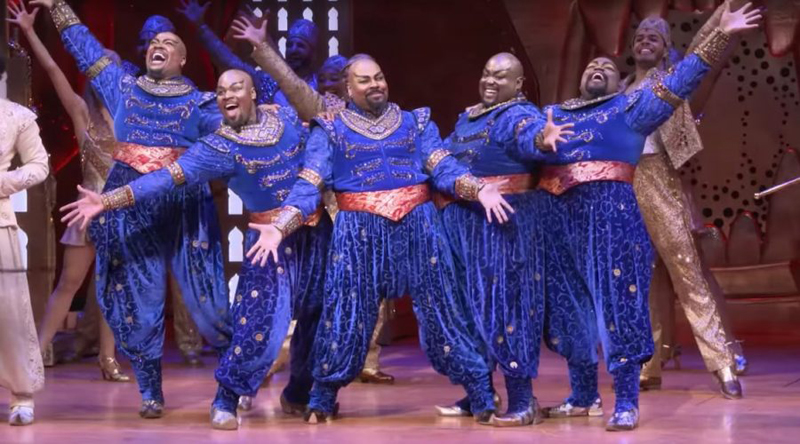 Grande sorpresa per il pubblico che si è trovato ad assistere l’altra sera al musical “Aladdin” al New Amsterdam Theatre di Broadway. Per celebrare i 5 anni in scena a New York la Disney ha affiancato all’attuale interprete del Genio della Lampada anche 4 altri per eseguire un medley di brani dal musical.Si trattava di James Monroe Iglehart, l’interprete attuale Michael James Scott, il Genio della versione tour Major Attaway, e le attuali cover di Broadway Juwan Crawley e Deonte L. Warren. Beh che dire … cose che accadono solo a Broadway!